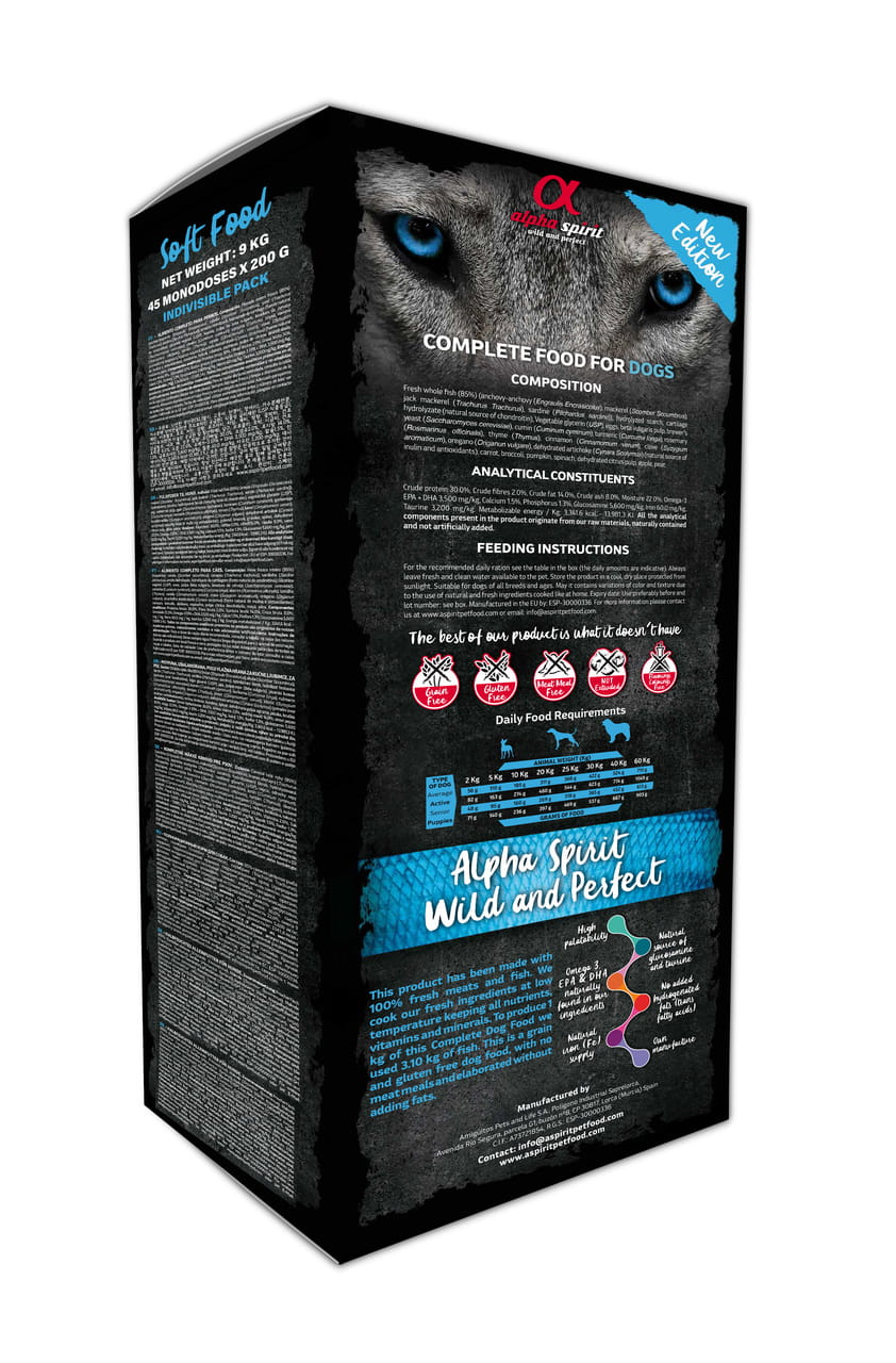 Pełnoporcjowa Karma dla Psów Wild Fish to wyjątkowa karma sucha miękka. Jej skład to aż 85% świeżych ryb. Wysokiej jakości składniki, otrzymujemy od lokalnych dostawców. Produkt jest naturalny, przygotowywany w niskiej temperaturze, dzięki czemu karma zachowuje właściwości odżywcze. Zawiera kwasy omega oraz wysokowartościowe kwasy tłuszczowe, wzmacniające układ odpornościowy. Mają one wpływ na zdrową i lśniącą sierść Czworonoga.