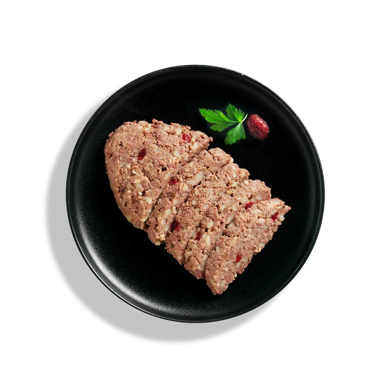 mięso kaczki, serce, wątróbka (34 %); mięso jagnięce, wątróbka, flaki, płuca, serce (31 %); bulion z kaczki i jagnięciny (27,5 %); gotowany ryż (4 %); borówki brusznicy (2 %); olej szafranowy (0,5 %); skorupki jaj, suszone (0,5 %); minerały (0,5 %)