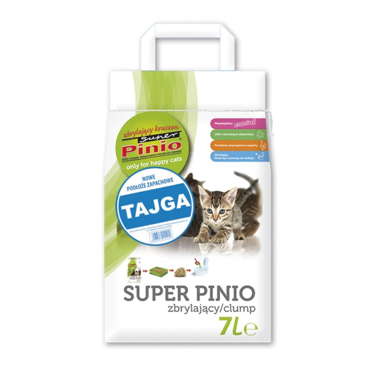 Super Pinio ZBRYLAJĄCY KRUSZON O ZAPACHÓW LASÓW TAJGI to całkowicie naturalne, zbrylające podłoże higieniczne w postaci kruszonu przeznaczone dla zwierząt domowych. Produkowane jest z czystego drewna iglastego z dodatkiem naturalnych substancji klejących. Wyjątkowo lekkie, bezpyłowe, posiada bardzo wysoką wchłanialność płynów i zapachów. Charakterystyczna postać kruszonu oraz zdolność zbrylania się pozwala w prosty i wygodny sposób utrzymać czystość i higienę w każdej kuwecie i klatce.