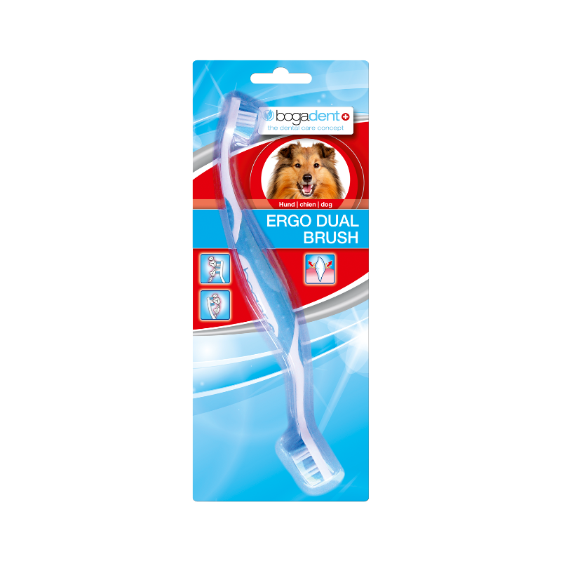 Płytka nazębna i kamień nazębny gromadzą się szczególnie wokół zębów trzonowych i mogą powodować trwałe uszkodzenie dziąseł i podtrzymującej tkanki łącznej. Płytkę nazębną należy zatem usuwać zawczasu i regularnie. W tym celu, we współpracy z weterynarzami, opracowaliśmy zupełnie nowy rodzaj szczoteczki do zębów, bogadent® ERGO DUAL BRUSH. Jej specyficzny ergonomiczny i funkcjonalny kształt pozwala na łatwe czyszczenie zębów. Szczoteczka została specjalnie zaprojektowana by dotrzeć nawet do wewnętrznej części zębów trzonowych.