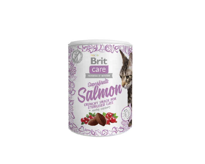 Bezzbożowa super żywność — przekąska dla sterylizowanych kotów. Łosoś, owoc dzikiej róży, żurawina.