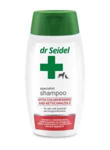 Dr Seidel Szampon z Chlorheksydyną i Ketokonazolem opracowany do pielęgnacji skóry zwierząt podczas terapii stanów zapalnych skóry wywołanych: zakażeniami bakteriami gram-dodatnimi i gram-ujemnymi oraz zakażeniami grzybiczymi (w tym drożdżakami).