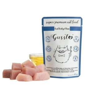 Pełnowartościowa, kompletna i znakomicie zbilansowana karma superpremium dla kotów. Produkowana jest w 100% z najwyższej jakości świeżego mięsa w wysokim standardzie odpowiadającym wymaganiom żywności dla ludzi. Gussto to esencja dobrego i zdrowego żywienia. Zawiera bardzo dużo mięsa idealnie odpowiadając specyficznym wymaganiom pokarmowym kotów. Jest to karma lekkostrawna i bardzo dobrze przyswajalna. Znakomicie zrównoważony stosunek wapń/fosfor minimalizuje ryzyko chorób układu moczowego i nerek. Karma Gussto zawiera dużo niezbędnych witamin i minerałów jest bardzo bogata w Taurynę i Biotynę, a w jej skład wchodzi dobroczynny olej z ostropestu – bogaty w nienasycone kwasy tłuszczowe, który ma działanie przeciwzapalne, reguluje czynności trawienne i regeneracyjne wątroby oraz wzmacnia system odpornościowy.