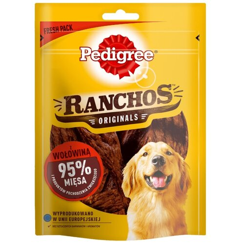 PEDIGREE® RANCHOS Originals z Wołowiną to 95% mięsa i produktów pochodzenia zwierzęcego. Jest pysznym i delikatnym suszonym przysmakiem, który zaspokaja naturalne instynkty psa. PEDIGREE® RANCHOS Originals są starannie suszone, aby zachować kuszący zapach i smak, które psy uwielbiają. W każdej porcji znajdują się starannie dobrane składniki, połączone w wygodną formę przekąski, idealną podczas spaceru lub zabawy z psem. Przysmak Ranchos Originals z Wołowiną został opracowany pod okiem specjalistów ds. żywienia i lekarzy weterynarii w Centrum Żywienia Zwierząt WALTHAM. W procesie wytwarzania używane są najwyższej jakości składniki, bez dodatku sztucznych aromatów i barwników. PEDIGREE® RANCHOS Originals z Wołowiną to idealna przekąska dla dorosłego psa.