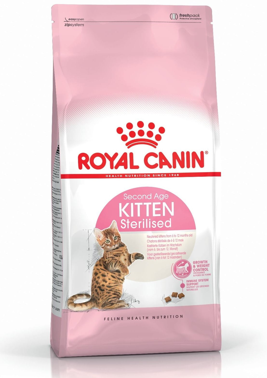 Royal Canin Kitten Sterilised to pełnoporcjowa karma dla kociąt po sterylizacji. Charakteryzuje się umiarkowanym poziomem tłuszczu, aby ograniczyć przyrost masy ciała, nie zmniejszając przy tym ilości spożywanego białka, wapnia i fosforu, niezbędnych do prawidłowego rozwoju kocięcia. Zawarty w karmie kompleks przeciwutleniaczy (witamina C i E, luteina, tauryna) pomaga wspierać naturalne mechanizmy obronne kociąt. Unikalna kombinacja składników odżywczych, w tym wysokostrawnego białka (L.I.P.*), psyllium i prebiotyków (w tym FOS), wpływa korzystnie na rónowagę flory bakteryjnej układu pokarmowego i jakość odchodów. Dodatkowo, receptura karmy wspiera prawidłowe funkcjonowanie układu moczowego kociąt.