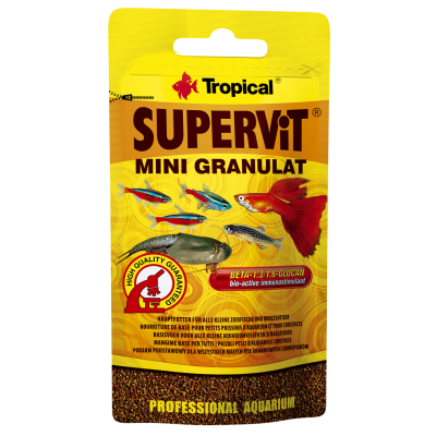 SUPERVIT MINI GRANULAT to uniwersalny pokarm w formie drobnego, tonącego granulatu do codziennego karmienia małych ryb akwariowych, dorastającego narybku, krewetek karłowatych oraz przekopnic.