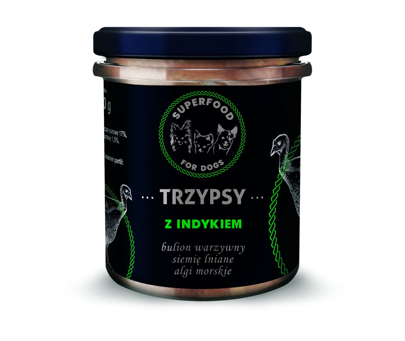 Wieprzowina 57% (płuca wieprzowe 17%, śledziona wieprzowa 15%, wątroba wieprzowa 11%, nerki wieprzowe 7%, skórki wieprzowe 7%), indyk 15% (mięso indycze drobne z uda 10%, wątroba indycza 3%, żołądki indycze 2%,) bulion warzywny, siemię lniane 2%, algi morskie, minerały, ekstrakt ziołowy.
