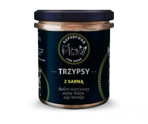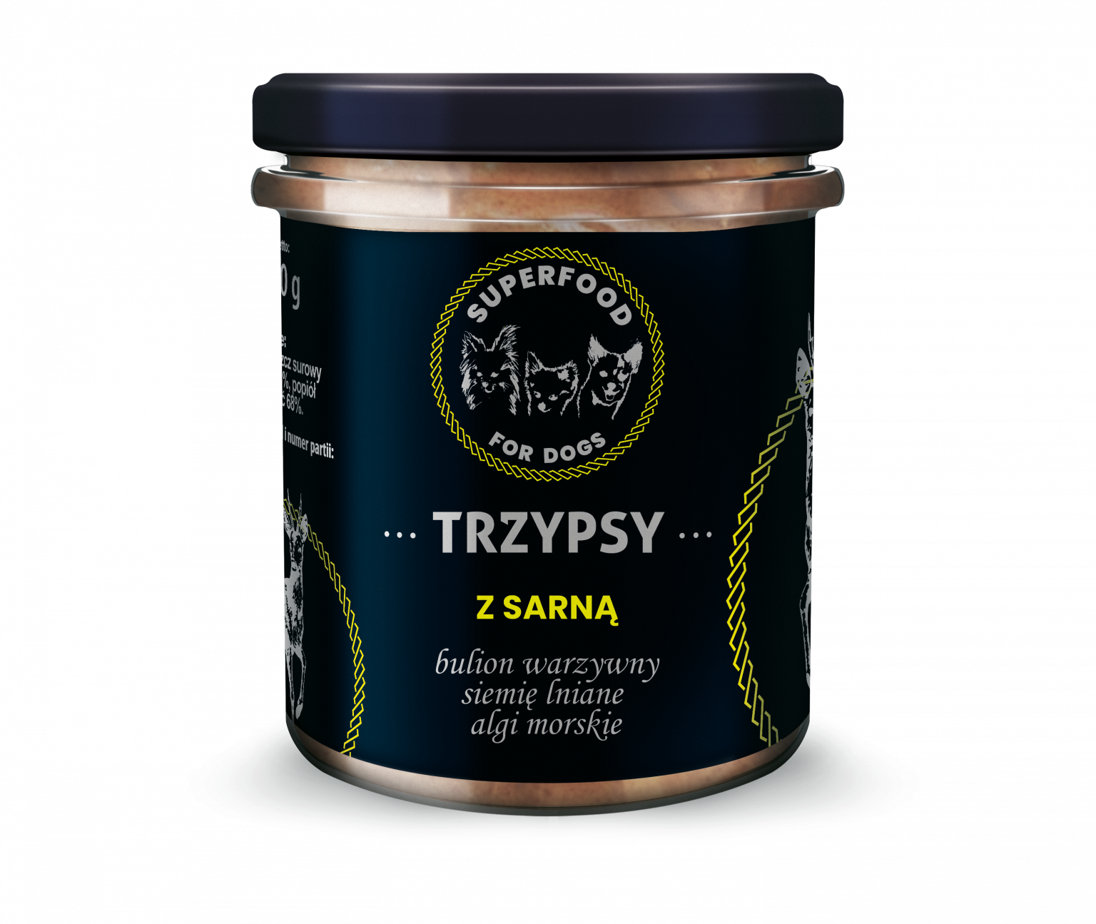 Skład: Wieprzowina 60% (mięso 20% , wątroba 20%, nerki 15%, płuca 15%, śledziona 15%, skóry 15%), sarna 15% (mięso), bulion warzywny, substancje mineralne, siemię lniane 0,2%, algi morskie 0,1%