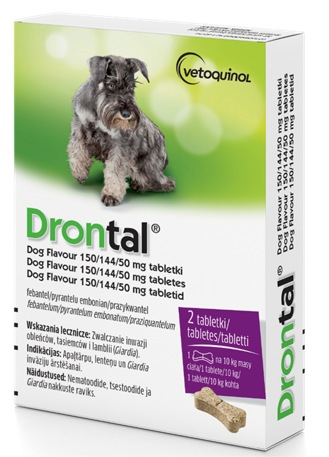 Drontal Dog Flavour 150/144/50mg tabletki febantel/pyrantelu embonian/prazykwantel • Wskazania lecznicze: Zwalczanie inwazji mieszanych, wywoływanych przez nicienie i tasiemce następujących gatunków: Robaki obłe: Glisty (postać dorosła i późna niedojrzała): Toxocara canis, Toxascaris leonina • Tęgoryjce (postać dorosła): Uncinaria stenocephala, Ancylostoma caninum • Włosogłówki (postać dorosła): Trichuris vulpis • Tasiemce (postać dorosła i późna niedojrzała): Echinococus granulosus, Echinococcus multilocularis, Dipylidium caninum, Taenia spp., Mesocestoides spp. Zwalczanie inwazji pierwotniaków Giardia spp. u szczeniąt i dorosłych psów.• Przeciwwskazania: Nie stosować w przypadku nadwrażliwości na substancję czynną lub na dowolną substancję pomocniczą. Nie stosować w 1. i 2. trymestrze ciąży. • Podmiot odpowiedzialny: Vetoquinol S.A. Francja • Przed użyciem zapoznaj się z treścią ulotki dołączonej do opakowania.