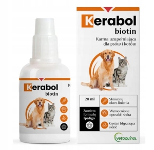 Kerabol biotin to karma uzupełniająca do stosowania przy nadmiernym wypadaniu, łamliwej, matowej i suchej sierści psów i kotów.