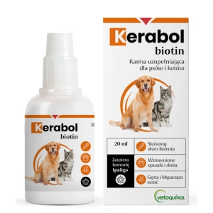 Vetoquinol Kerabol Biotin 20/50ml - karma uzupełniająca do stosowania przy nadmiernym wypadaniu włosów, łamliwej, matowej i suchej sierści