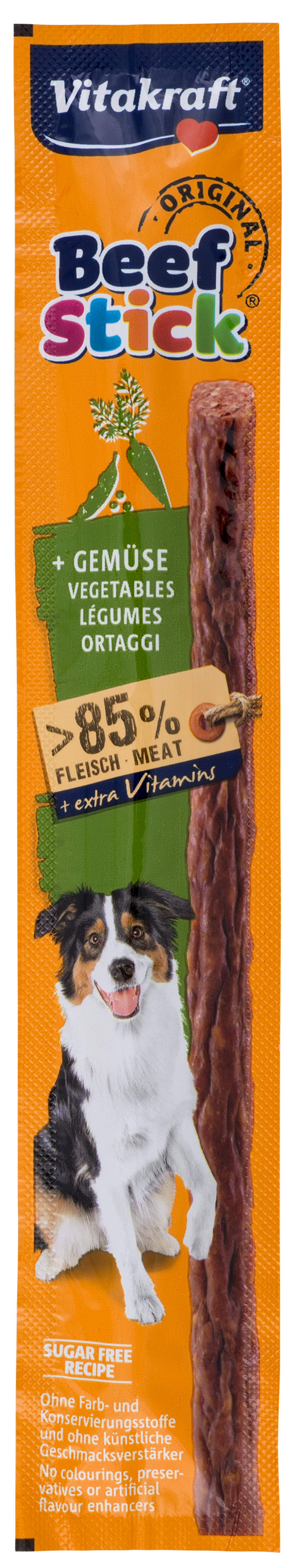 Vitakraft Beef Stick to mięsny przysmak z wołowiną, groszkiem i marchewką.