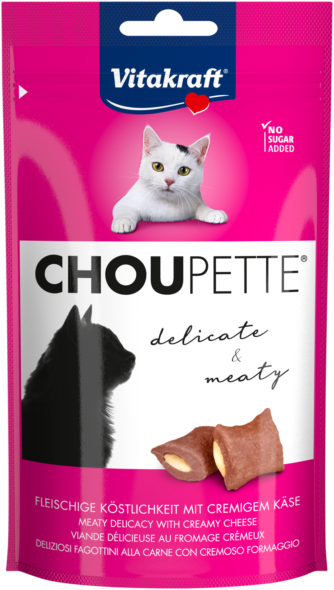Vitakraft Cat Choupette - pyszne, mięsne poduszki wypełnione kremowym serem. Karma uzupełniająca dla kotów - przysmak z wysoką zawartością mięsa i z serowym nadzieniem.