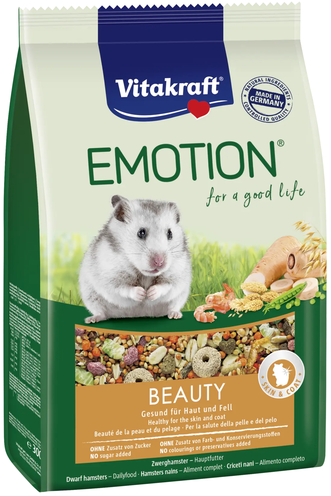 Vitakraft Emotion Beauty Selection to pełnoporcjowa karma z recepturą dla zdrowej skóry i pięknej sierści chomików.