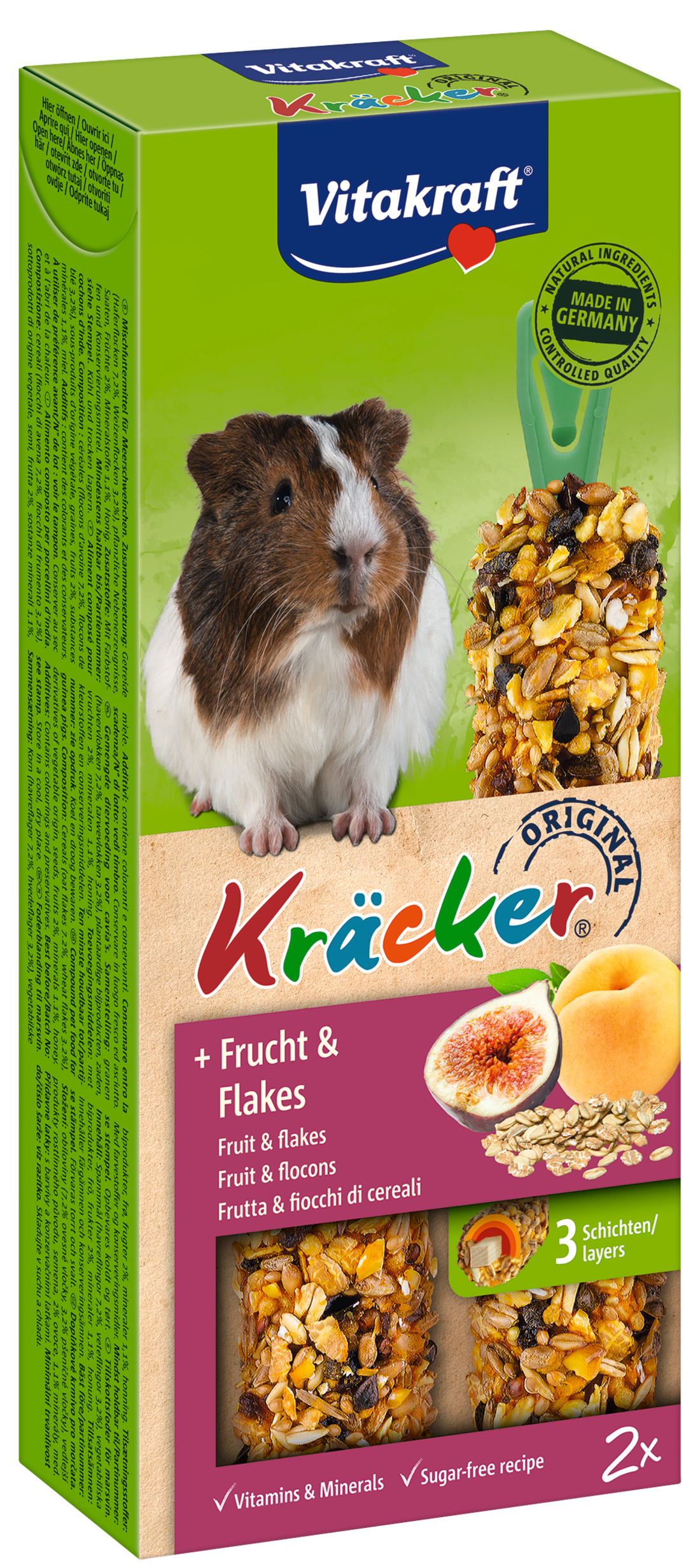 KRÄCKER FUNNY FITNESS - karma uzupełniająca dla świnek morskich. Najwyższej jakości przekąska z owocami i witaminą C. Kolby są potrójnie spiekane oraz posiadają drewniany patyczek do podgryzania.