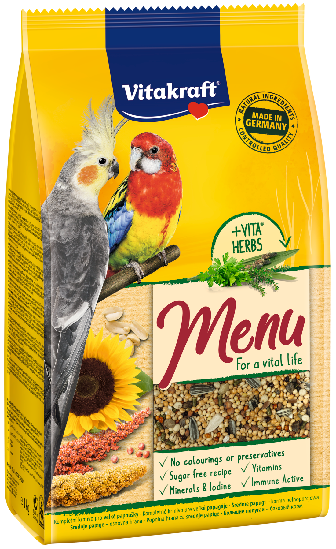 MENU VITAL - karma pełnoporcjowa z witaminami dla średnich papug. Zdrowa karma zawierająca starannie dobrane składniki dojrzałe na słońcu nasiona, smaczne zboże, orzechy i miód. Granulki Vital zawarte w karmie wzmacniają układ odpornościowy oraz dostarczają ważnych dla organizmu witamin i minerałów. Karma zapobiega objawom niedoboru składników odżywczych, gwarantuje dobre samopoczucie oraz zapewnia kompleksowe, wyważone, naturalne i zdrowe odżywianie. Karma nie zawiera barwników, konserwantów ani cukru. 100% świeżości dzięki opakowaniu z możliwością wielokrotnego zamykania.