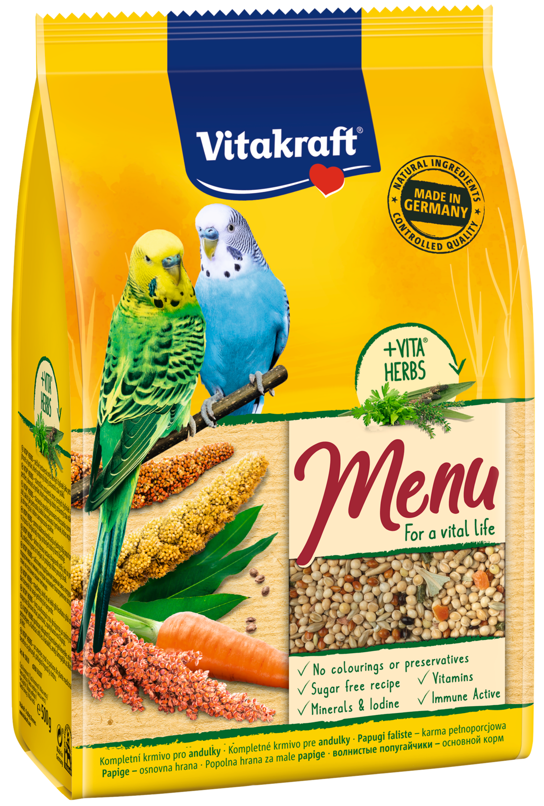 MENU VITAL - karma pełnoporcjowa dla papużek falistych. W swoim naturalnym, australijskim środowisku papużki faliste odżywiają się zróżnicowaną karmą, bogatą w niezbędne elementy odżywcze. Karma pełnoporcjowa PREMIUM MENU to starannie opracowana receptura zawierająca bogate w białko obrane nasiona oraz wyselekcjonowane, dojrzewające w słońcu ziarna. Czerwone, żółte i białe proso oraz owies mają za zadanie chronić system odpornościowy przed mikroorganizmami, poprawiać stan zdrowia oraz samopoczucie ptaków. Karma jest wzbogacona o miód i elementy śladowe, natomiast zawartość jodu utrzymuje tarczycę w dobrej kondycji. Karma pełnoporcjowa PREMIUM MENU wspiera metabolizm oraz dostarcza niezbędnych witamin i minerałów, zapobiegając symptomom ich niedoboru. Miód oraz olej z wątroby dorsza sprawiają, że papużka pozostaje aktywna i przyspieszają wzrost piór.