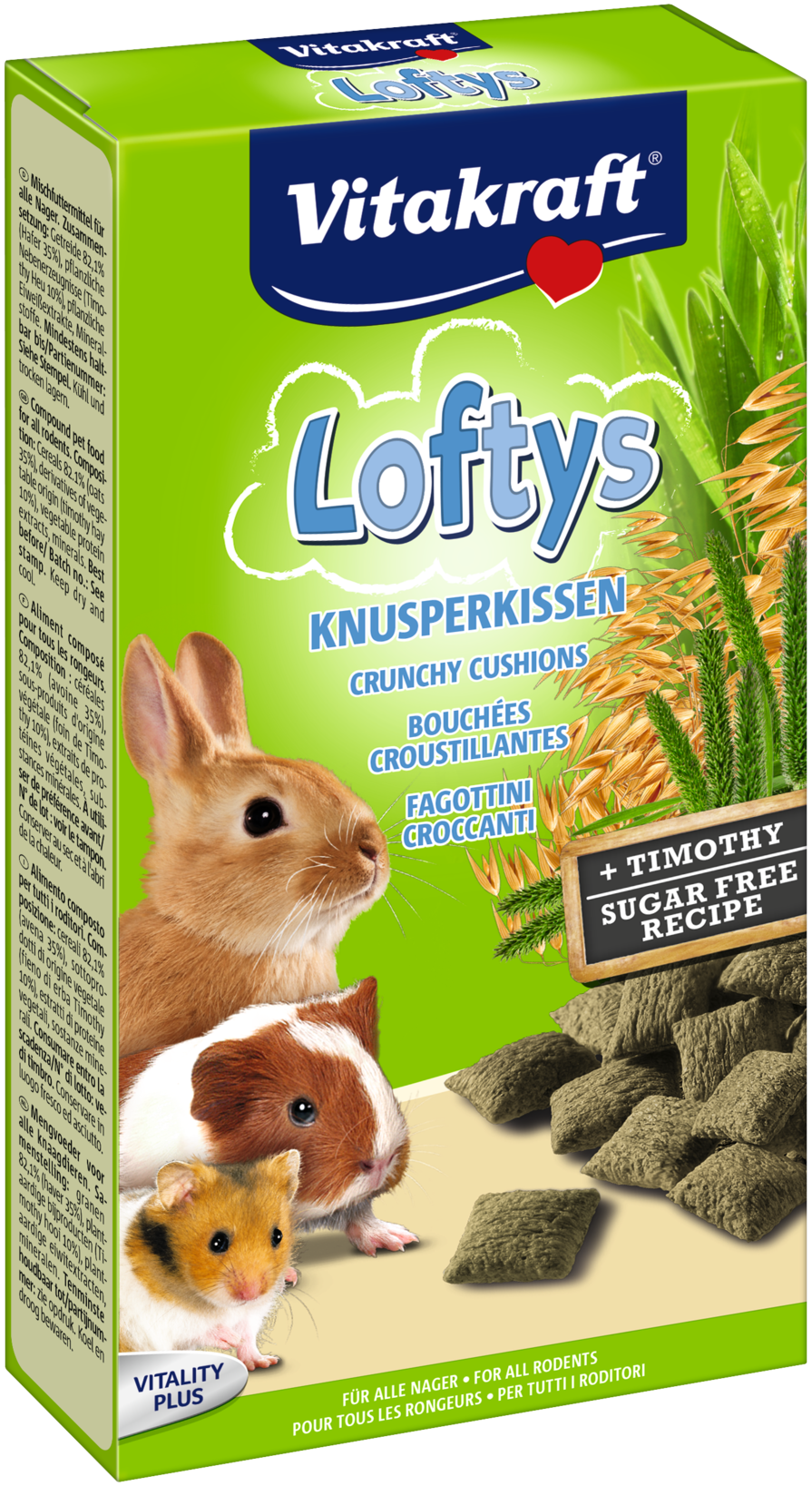 Karma uzupełniająca dla królików, świnek morskich, myszek, myszoskoczków, szczurków i chomików. Vitakraft Lofty to chrupiące zbożowe poduszeczki, zawierające smakowite ziarna owsa, pokrzywę i słód jęczmienny. To smaczna, naturalna przekąska dla gryzoni i królików.