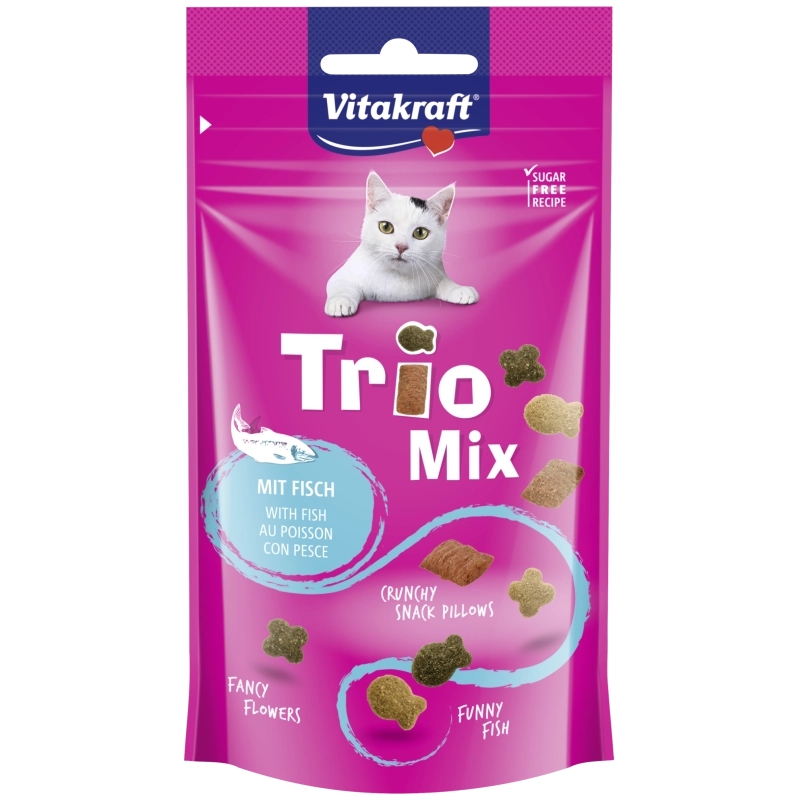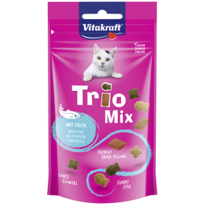 Vitakraft Trio Mix Ryba 60 g to smakowita karma uzupełniająca dla kotów, idealna jako przekąska między posiłkami lub nagroda. Produkt zawiera mieszankę trzech różnych form przysmaków – chrupiących ciasteczek o zróżnicowanych kształtach i strukturze, które urozmaicają dietę oraz zachęcają kota do aktywnego jedzenia.
