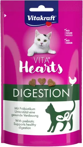 Vitakraft Vita Hearts Digestion to smaczny przysmak dla kotów, wspierający prawidłowe funkcjonowanie układu pokarmowego. Delikatne serduszka z kurczaka są bogate w błonnik i składniki wspomagające trawienie, dzięki czemu mogą być podawane jako nagroda lub dodatek do codziennej diety. Produkt nie zawiera sztucznych barwników ani konserwantów.