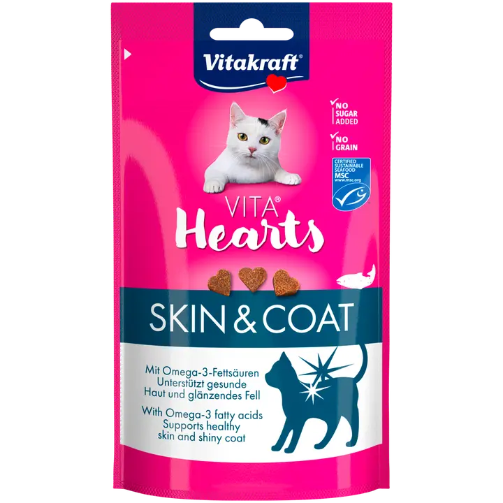 Vitakraft Vita Hearts Skin & Coat to smaczny przysmak dla kotów, wspierający zdrową skórę i sierść. Serduszka z łososia zawierają cenne kwasy tłuszczowe omega-3 i omega-6, witaminy oraz minerały, które pomagają utrzymać sierść miękką, błyszczącą i łatwą do pielęgnacji. Produkt doskonale sprawdza się jako nagroda lub uzupełnienie codziennej diety. Nie zawiera sztucznych barwników ani konserwantów.
