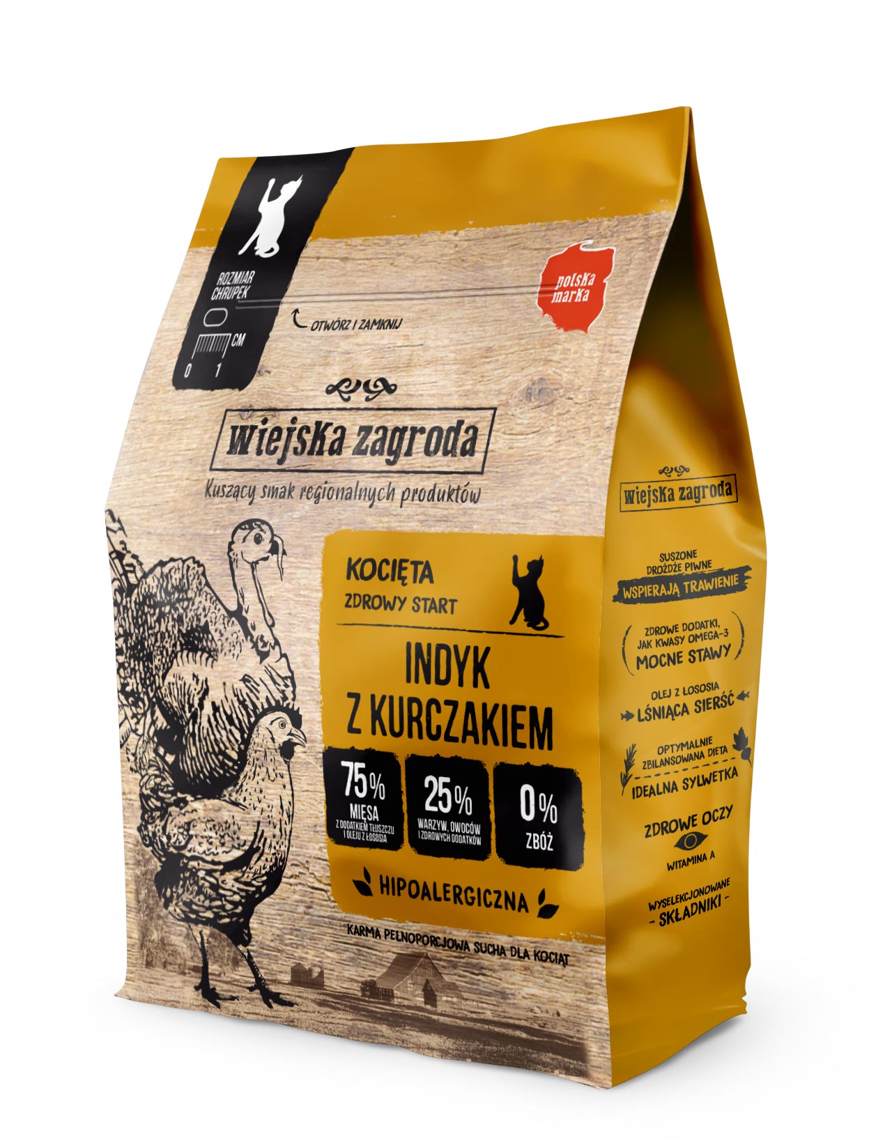 Wiejska Zagroda to polska, przygotowana z najwyższą starannością pełnoporcjowa karma dla kociąt. Regionalne produkty od lokalnych dostawców to gwarancja świeżości i jakości składników, z których przygotowujemy nasze karmy. Karmy powstały z potrzeby podania naszym kociętom tego, czego najbardziej potrzebują, czyli mięsa! To właśnie mięso stanowi minimum. 65,5% składu każdej z karm.